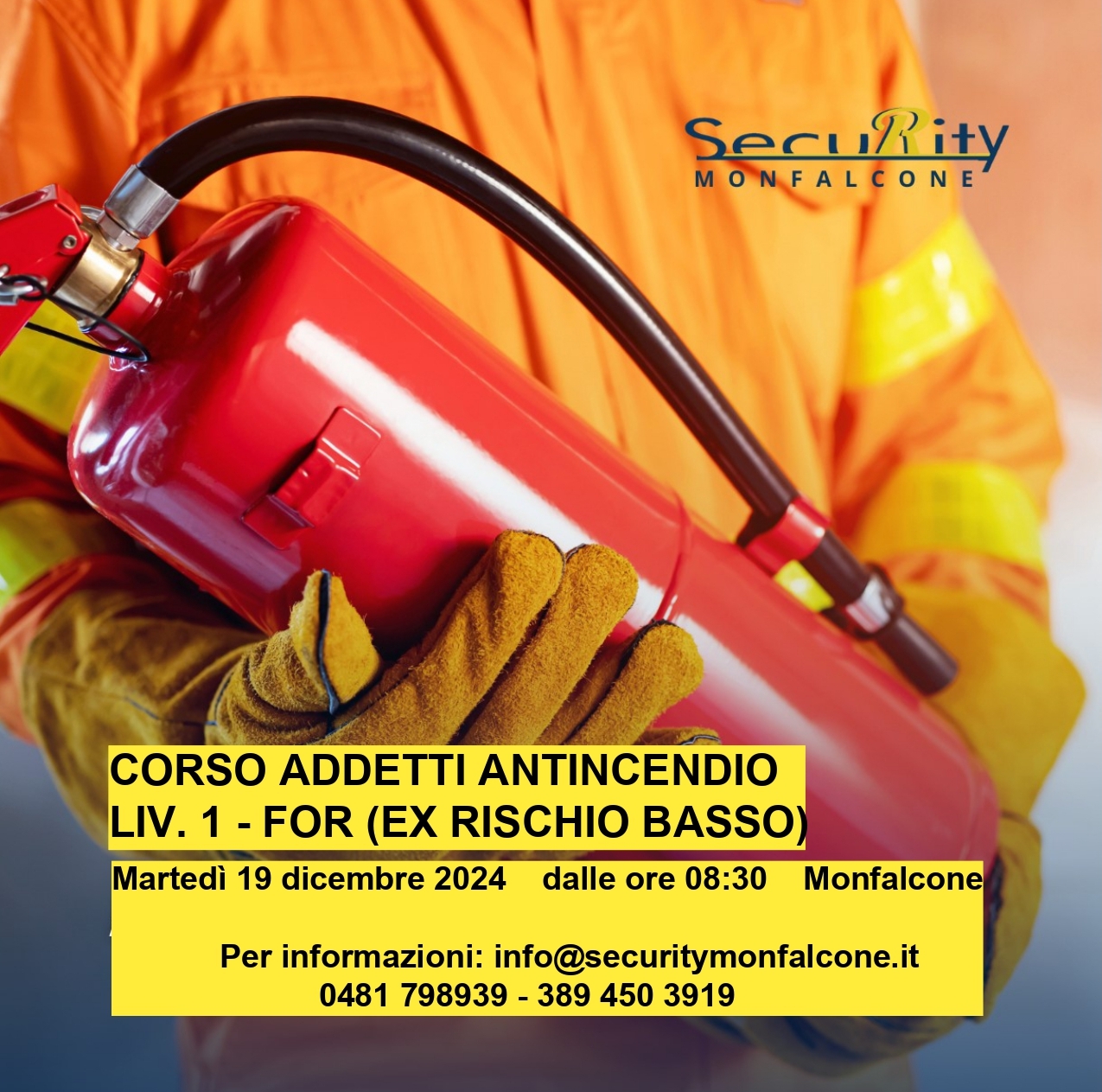 Corso per addetti antincendio per aziende di livello 1-for (ex rischio basso): 4 ore di formazione teorica, comprese prove tecniche obbligatorie di estinzione del fuoco e utilizzo dei dispositivi antincendio, come previsto dal D.M. 2 settembre 2021.
